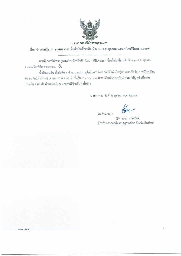 ประกาศสถานีตำรวจภูธรแม่กา เรื่อง ประกาศผู้ชนะการเสนอราคา ซื้อน้ำมันเชื้อเพลิง