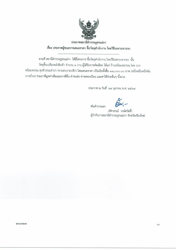 ประกาศสถานีตำรวจภูธรแม่กา เรื่อง ประกาศผู้ชนะการเสนอราคา ซื้อวัสดุสำนักงานโดยวิธีเฉพาะเจาะจง