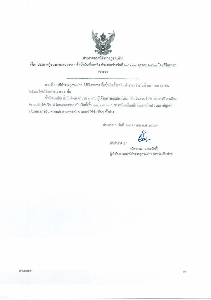 ประกาศสถานีตำรวจภุธรแม่กา เรื่อง ประกาศผู้ชนะการเสนอราคา ซื้อน้ำมันเชื้อเพลิงและหล่อลื่น