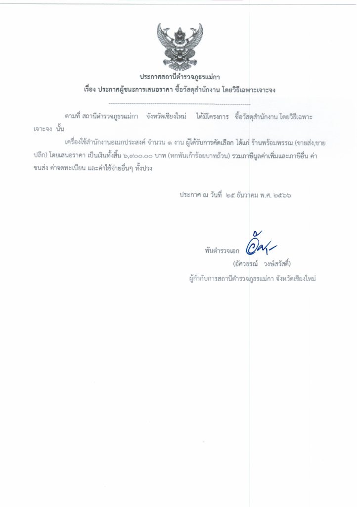 ประกาศสถานีตำรวจภุธรแม่กา เรื่อง ประกาศผู้ชนะการเสนอราคา ซื้อวัสดุสำนักงาน โดยวิธีเฉพาะเจาะจง