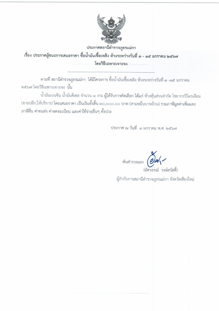 ประกาศสถานีตำรวจภูธรแม่กา เรื่อง ประกาศผู้ชนะการเสนอราคา ซื้อน้ำมันเชื้อเพลิง
