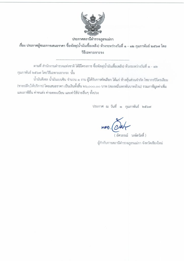 ประกาศสถานีตำรวจภูธรแม่กา เรื่อง ประกาศผู้ชนะการเสนอราคา ซื้อน้ำมันเชื้อเพลิง