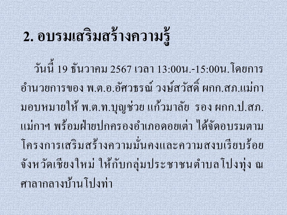ผลการปฏิบัติงานอำนวยการ ธันวาคม 2567 1 มกราคม 2568 โดย admmaeka / งานอำนวยการ รูปแบบไฟล์ PDF รูปแบบไฟล์ WORD Post Views: 12 FacebookFacebookXXLINELine