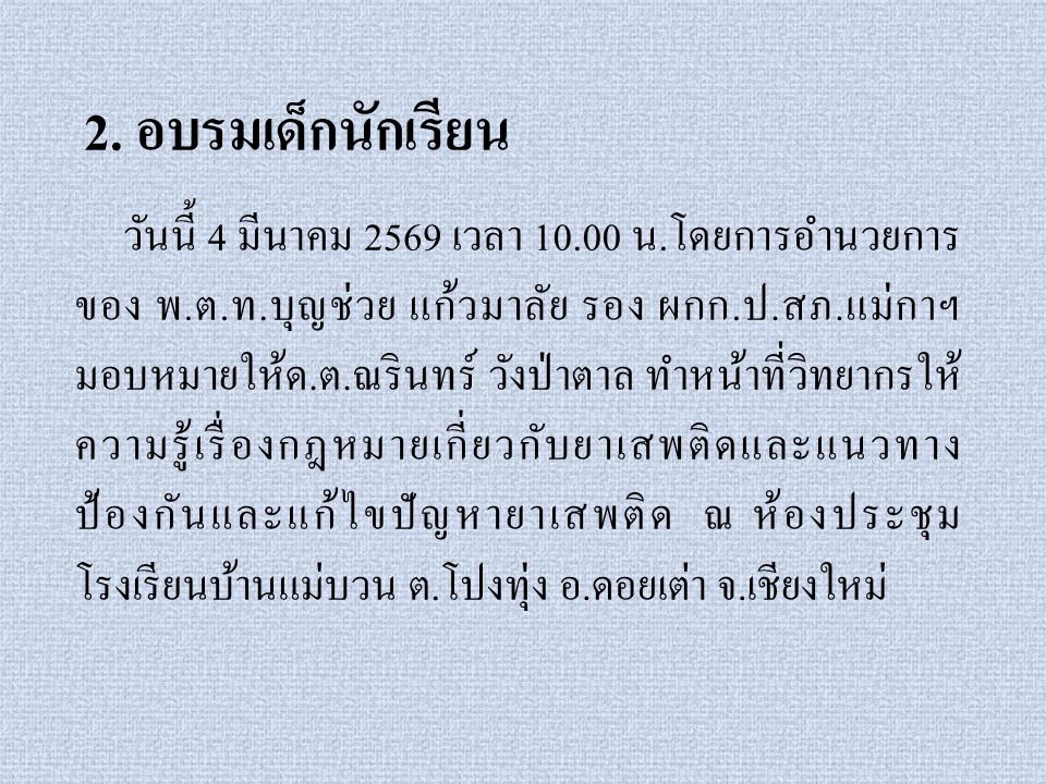 ผลการปฏิบัติงานอำนวยการ มีนาคม 2569 27 มีนาคม 2569 โดย admmaeka / งานอำนวยการ Post Views: 5 FacebookFacebookXXLINELine