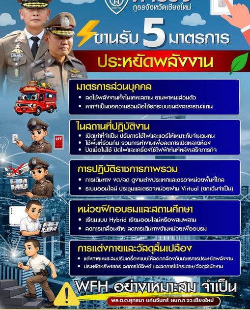 ตำรวจภูธรจังหวัดเชียงใหม่ ขานรับ 5 มาตรการประหยัดพลังงาน โดยไม่กระทบประชาชน เหมาะสม จำเป็น รับมือกับผลกระทบจากสถานการณ์ ความไม่สงบในตะวันออกกลาง ตามนโยบาย ผบ.ตร.