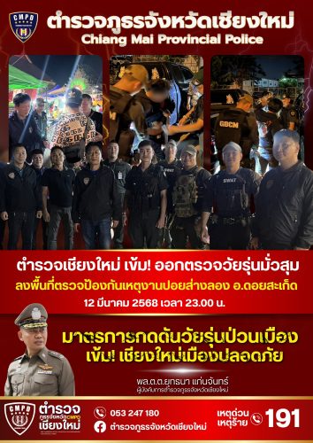 วันนี้ (12 มีนาคม 2568) หน่วยปฏิบัติการพิเศษ กองบังคับการตำรวจภูธรจังหวัดเชียงใหม่ ลงพื้นที่ตรวจสอบแ