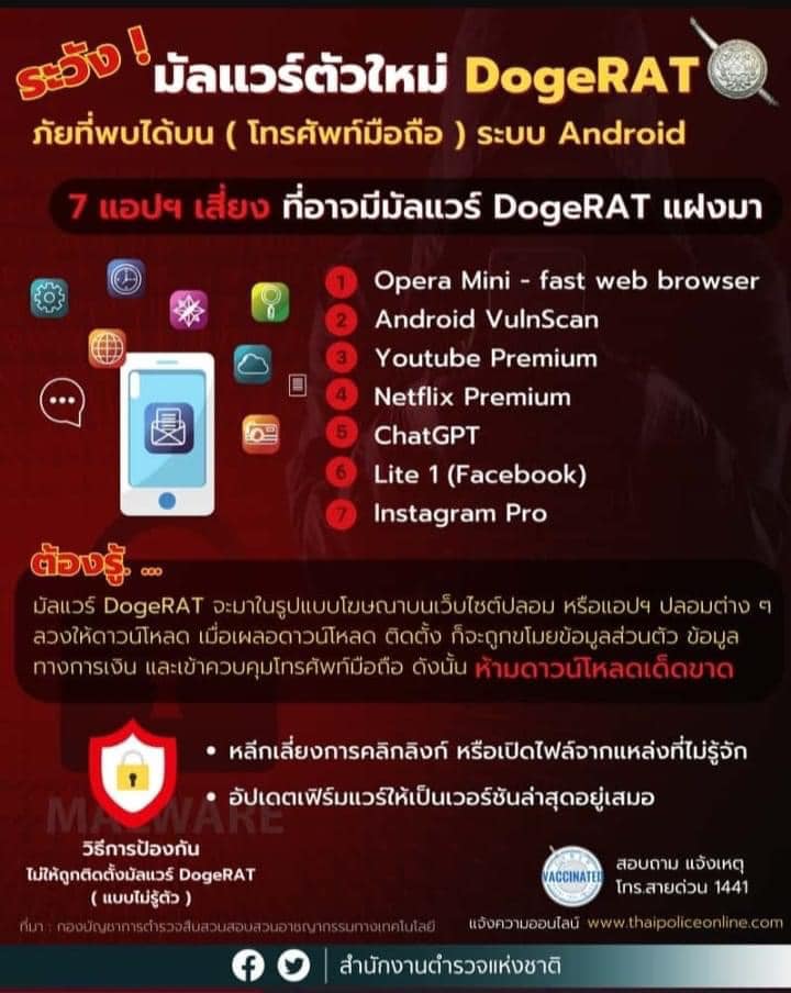 ระวัง!! มัลแวร์ DogeRAT จะมาในรูปแบบโฆษณาบนเว็บไซต์ปลอม หรือแอปฯ ปลอมต่าง ๆ ลวงให้ดาวน์โหลด เมื่อเผล