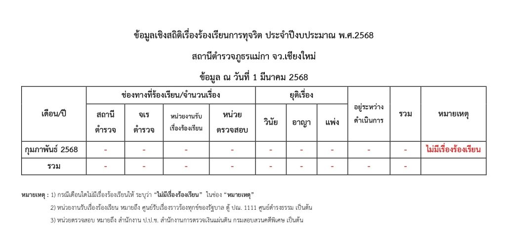 ข้อมูลเชิงสถิติเรื่องร้องเรียนการทุจริต เดือนกุมภาพันธ์ 2568
