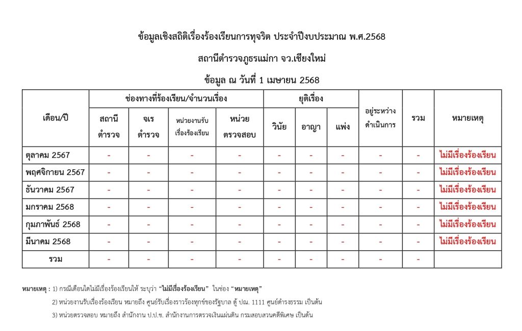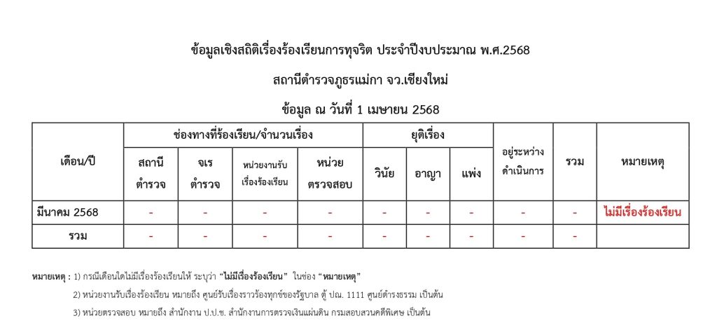 ข้อมูลเชิงสถิติเรื่องร้องเรียนการทุจริต เดือนมีนาคม 2568